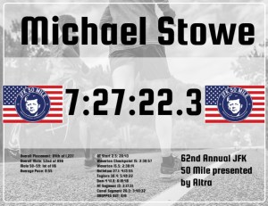 “That’s Michael Stowe from Blacksburg, VA. A first time finisher who is 54 years old, making him the oldest runner to finish so far today,” he said as I crossed the line in 7:27:22, arms raised in excitement,